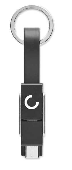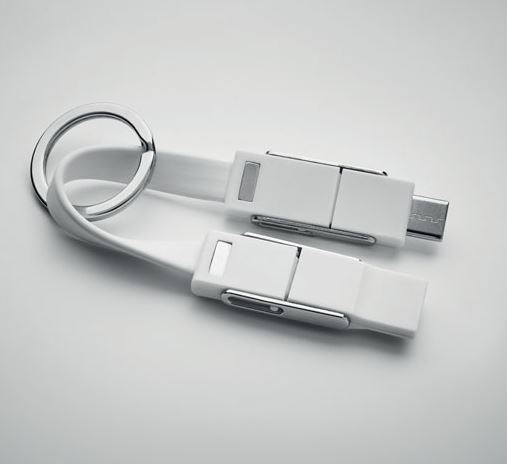 Key ring with 4-in-1 charging cable. In/Output: Type-C x2, Type-A, Micro USB.